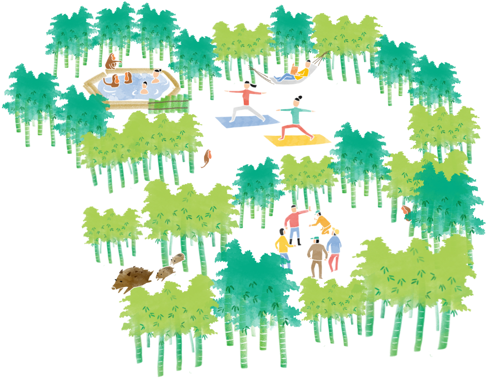 さらさらと笹の葉が奏でる音、青空に伸びるまっすぐな竹から漏れる木漏れ日、竹林に入ると不思議に心が落ち着きます。この素晴らしい空間で足湯、ヨガ、瞑想など…いろんなことができる竹林を再生したいと取組んでいます。